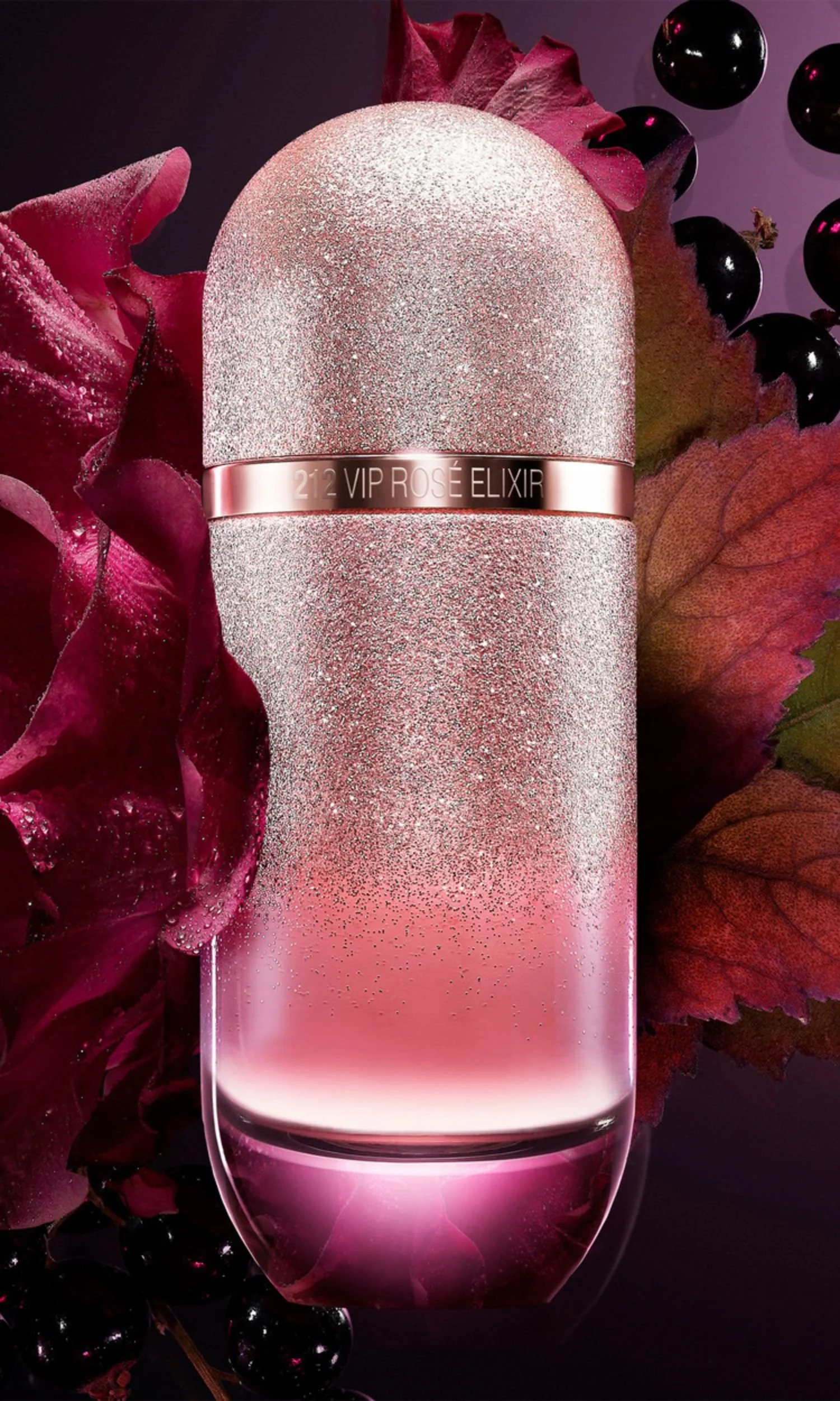 O icônico frasco do 212 VIP Rosé ganha um toque glamouroso e moderno com glitter degradê rosa, um convite cintilante para se expressar livremente.
